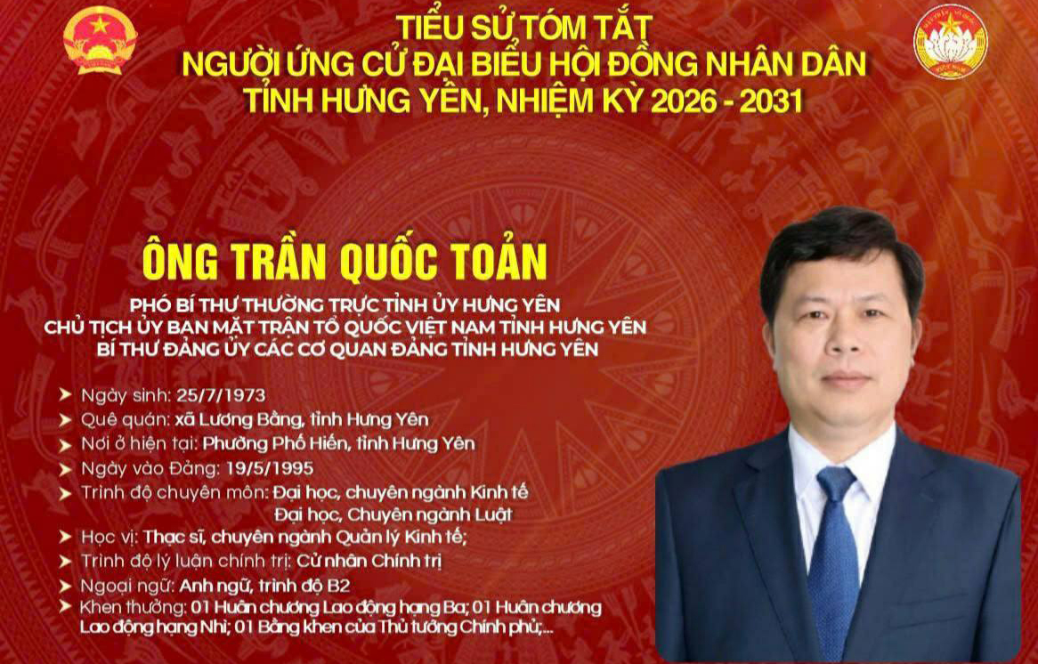 TIỂU SỬ VÀ CHƯƠNG TRÌNH HÀNH ĐỘNG CỦA ỨNG CỬ VIÊN ĐẠI BIỂU HĐND TỈNH KHÓA XVIII TẠI ĐƠN VỊ BẦU CỬ SỐ 6: ÔNG TRẦN QUỐC TOẢN